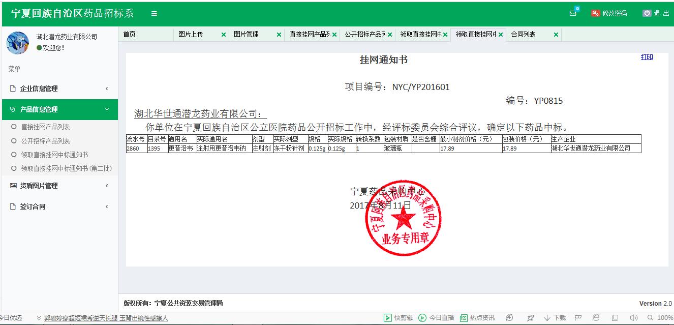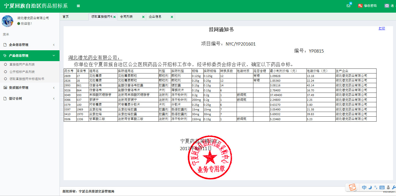 2017年8月11日,經(jīng)評標委員會綜合評議,確定我公司克拉霉素等藥品在寧夏回族自治區(qū)公立醫(yī)院藥品公開招標中中標,詳見中標通知書截圖!
